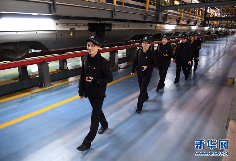 在南宁动车车载设备车间,几名女职工前往一列动车准备开始检测维护工作(1月16日摄)。