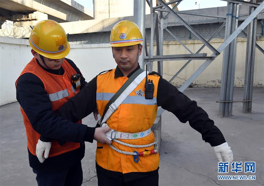 1月17日,在郑州东站附近的一座信号塔前,同事为牛军辉(右)检查安全带。 牛军辉是中国铁路郑州局集团有限公司郑州通信段的一名通信工,主要负责郑州东站疏解区南北3公里内6座信号塔的检修工作,常被同事们亲切地称为“天线宝宝”。 每次作业,牛军辉需要徒手爬到塔顶,对信号塔顶端天线的性能、角度、支架、构件、视频设备、光缆等进行检测、调试、保养,确保这些让高铁列车实现无线调度的“主引擎”万无一失,保障车站、列车之间的沟通顺畅。 新华社记者李嘉南摄