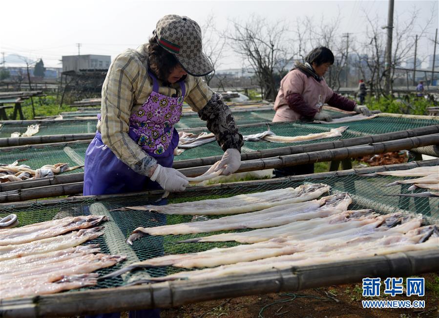 春节临近,浙江省舟山市普陀区观矸头村农户纷纷抢晒海鳗鱼干,供应节日市场。