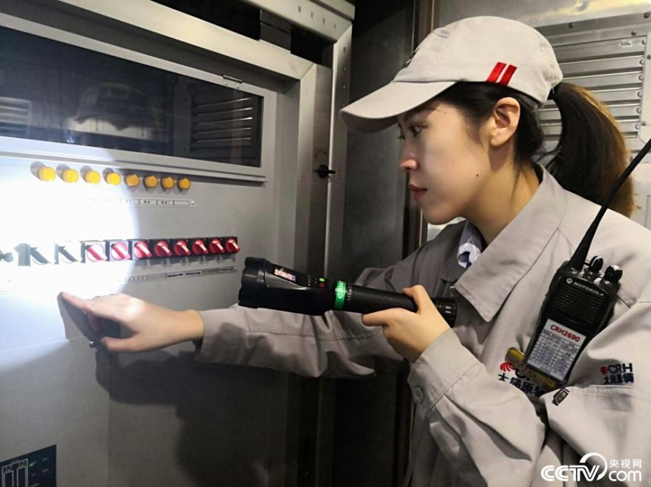 7点50分,G92次动车组出库到达太原南站,郭蕊要利用旅客上车前的最后时间对动车组驾驶室、服务设施、靠站台一侧的外观和动车组受电弓、端部等进行检查。记者 王莉莉 图片来源:央视网