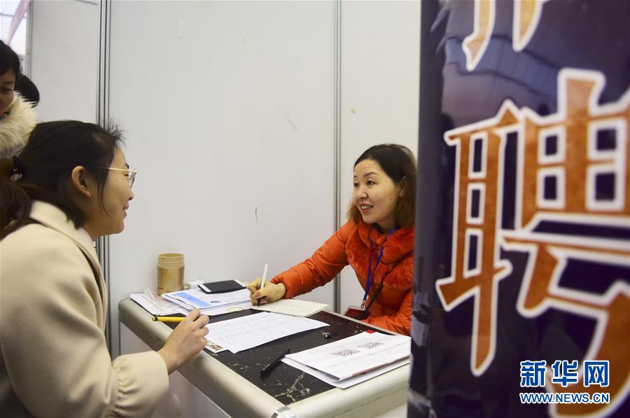 1月19日,求职者在招聘会现场与用人单位工作人员交流。