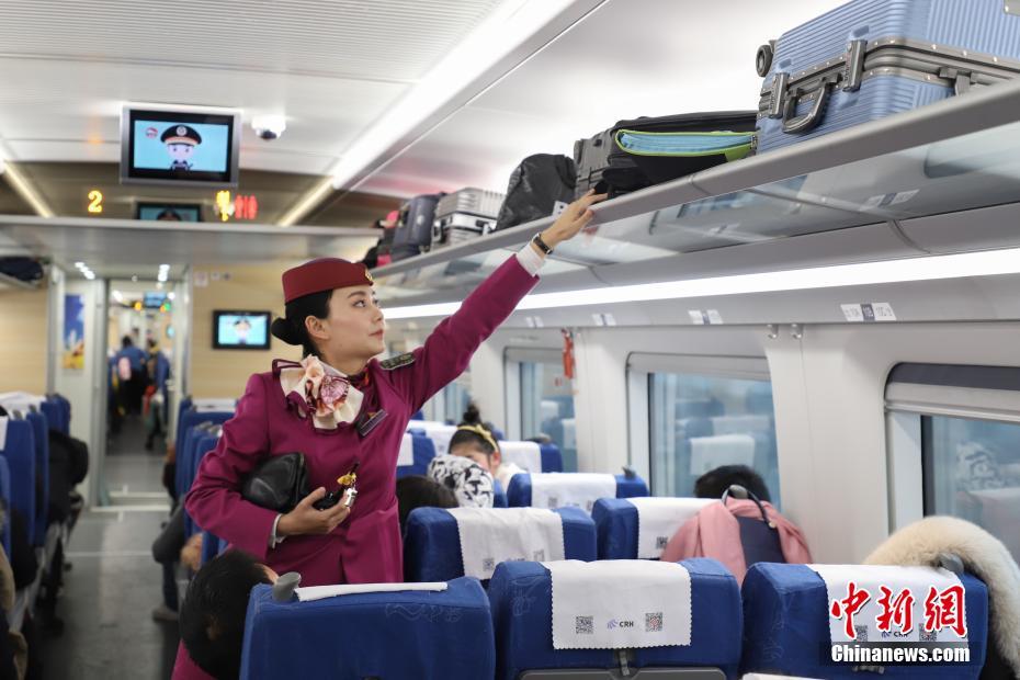 1月19日,伏玲在整理车厢内的行李架。今年27岁的伏玲,是中国铁路总公司成都局集团有限公司贵阳客运段动车二队列车长,她在铁路系统已经工作5年,是贵州首批动车乘务员,并于2016年取得动车列车长资质。伏玲主要有开车前的引导、巡视车厢、检查危险品等值乘工作。2019年春运临近,加开列车和旅客数量将增多,届时,她的工作量加大。她说,她已做好春运服务工作的准备,将用心服务好旅客,让旅客能够平平安安回家。中新社记者 瞿宏伦 摄