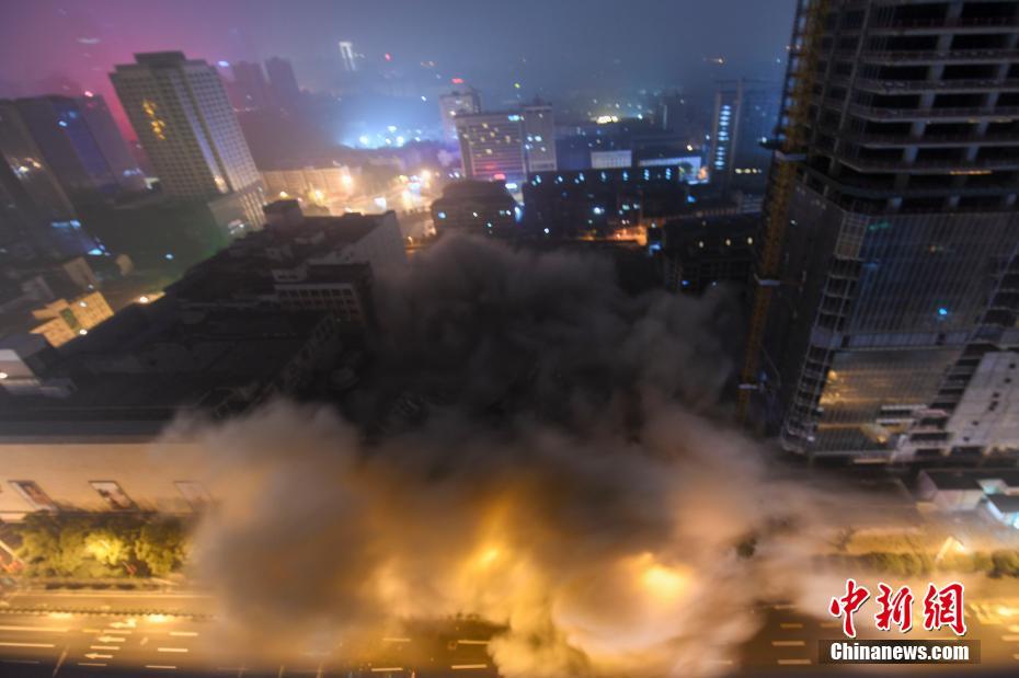 1月20日凌晨,长沙市旭华大厦农业银行综合楼成功爆破。该楼高62.3米,技术人员运用了炸药432公斤,雷管7300枚进行爆破,爆破时长2.81秒。中新社记者 杨华峰 摄