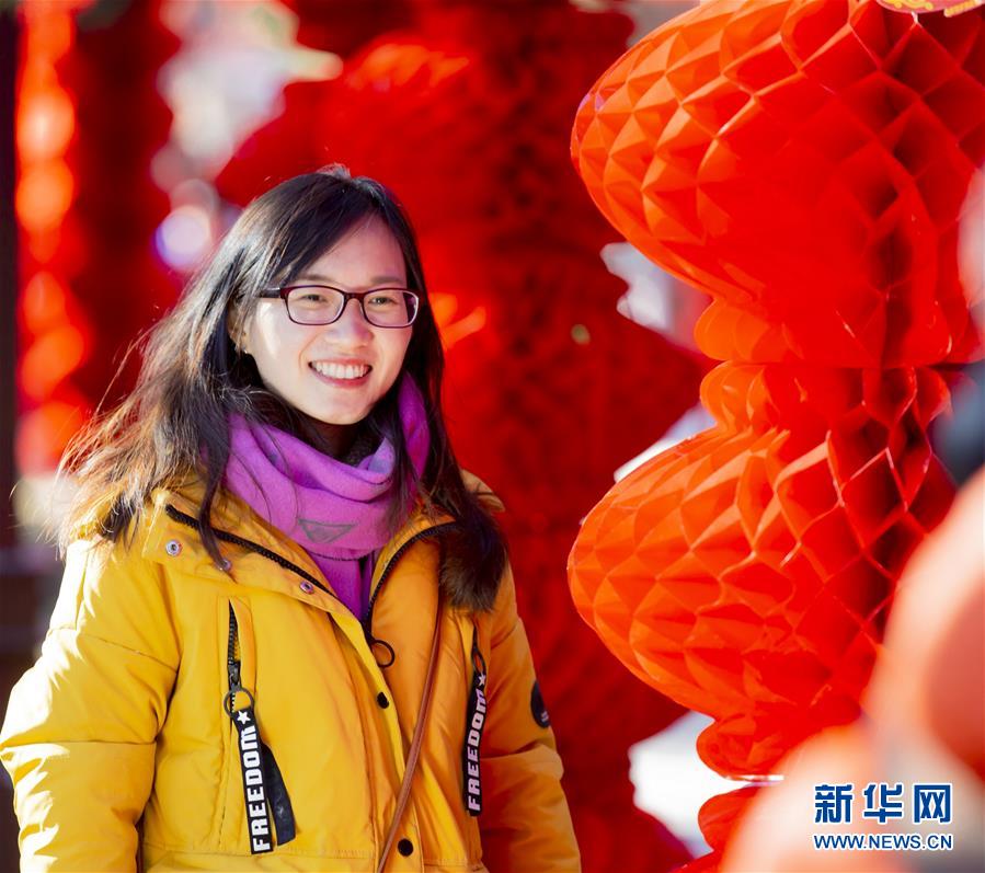1月20日,在北京地坛公园为春节庙会搭设的红灯笼前,一名女孩拍照留念。 新华社发