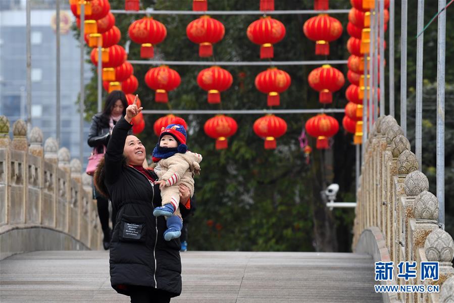 1月20日,贵州仁怀市民带着孩子在市民休闲广场观赏红灯笼。 新华社发(陈勇 摄)