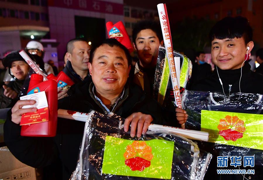 1月21日,来自江西省上饶市鄱阳县的孔幼荣(前左)与老乡们在福建泉州的一处“爱心驿站”领到免费的早餐、春联、加油卡和反光背心等爱心物资。 新华社记者 魏培全 摄