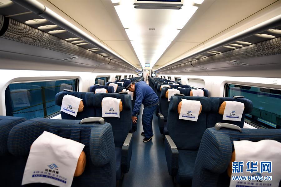 1月21日,赵海洲检查动车车厢内的座椅。 新华社记者 张楠 摄