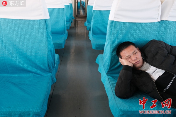这趟列车空荡荡,瞧,位子上,可以横躺着睡觉。 这位乘客脱了鞋子,睡觉正香。(本组图片来源东方IC,请勿转载。)