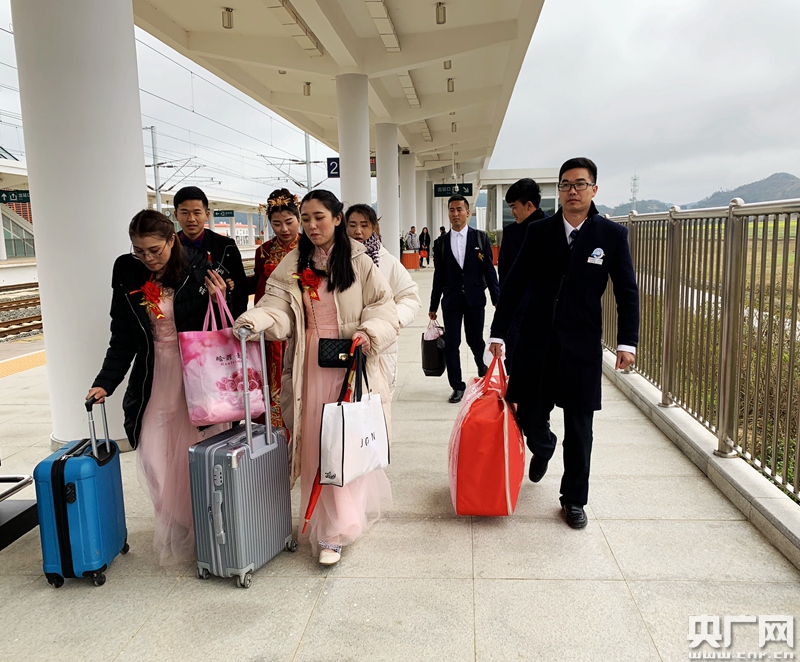 当天上午,D8707次列车进站后,这对新人在亲朋好友陪伴下,乘坐动车离开珠琳站,到达大理站后,他们将换乘汽车前住小伙的家乡。