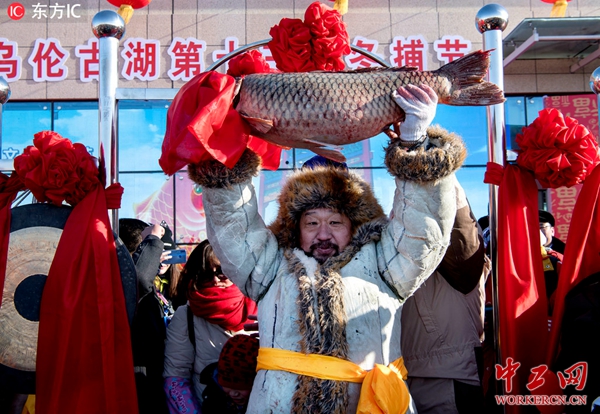 中工网讯 2019年1月21日, 冬捕大拉网共拉出5.8吨鱼,头鱼重达18.8公斤,新疆旺源生物科技集团有限公司以39.9999万元一举拍下头鱼,拨得冬捕节头筹。拍卖所得将用于购买鱼苗等,促进当地渔业绿色平衡发展。