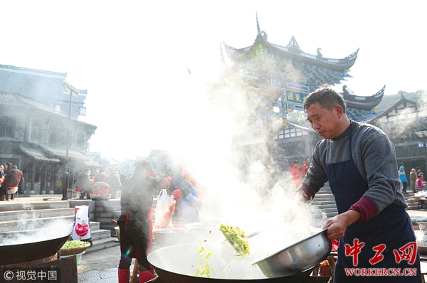 2019年1月22日,在四川省华蓥市阳和镇偏岩子村九龙溪移民新村居民丁世权儿子丁清华的婚宴上, 乡村大厨正在烹制菜肴。