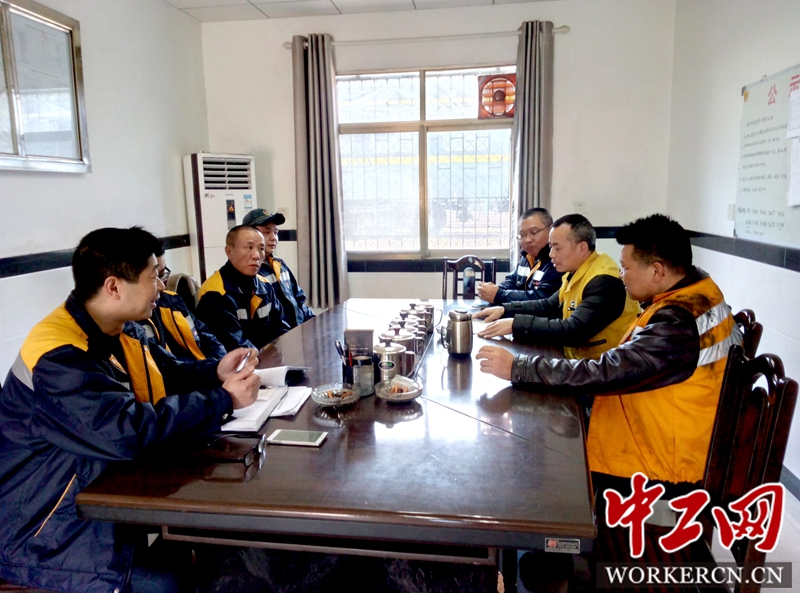 上午八点十分的开工会上,工长钟庆会分配好当天各人的工作任务,副工长刘永红再抛出“每日一题”让大家讨论,快速进入状态。(梁杰 摄影报道)