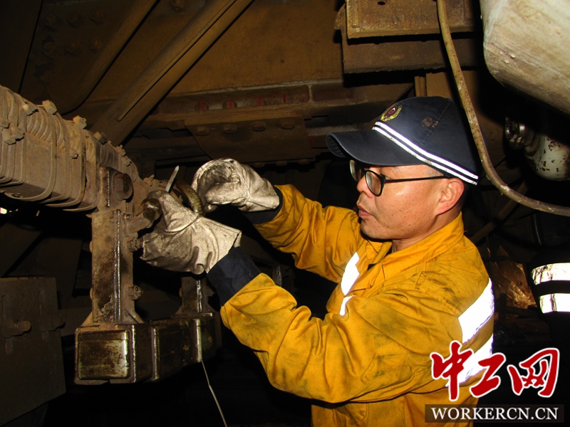 机车信号感机车信号感应线圈装在在车底,得钻进地沟作业,每回检查都会弄得作业人“灰头土脸”。刘敬清除掉厚厚的油灰,正在为感应线圈支架绑上新的扎带加固。(梁杰 摄影报道)