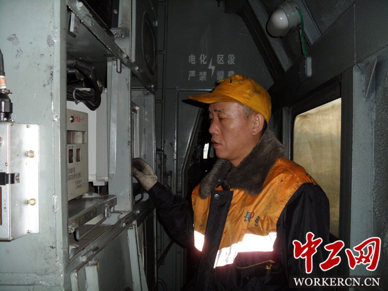 另一台车上,凌均利正在检查机车信号主机面板指示灯显示状态,同样的作业同时进行,同样的认真细致。(梁杰 摄影报道)