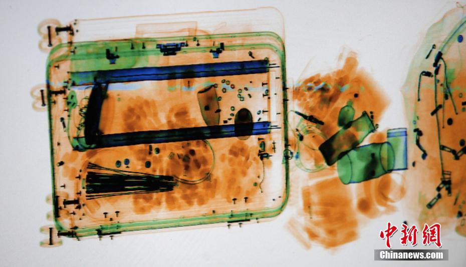 1月22日,2019年春运第二天,在江苏扬州汽车站的安检处,所有进站旅客的行囊都要进行安检,接受X光检查,旅客的行囊通过X光安检机,不同物品不同材质在监视器上呈现出五颜六色的水彩画。图为在安检仪X光扫描下的春运行囊犹如水彩画。孟德龙 摄