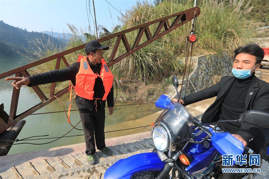 1月22日,何银祥在渡船上指挥乘客上船。 新华社记者 欧东衢 摄