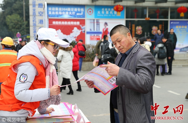 四川绵阳:青年志愿者服务春运 帮助返乡农民工