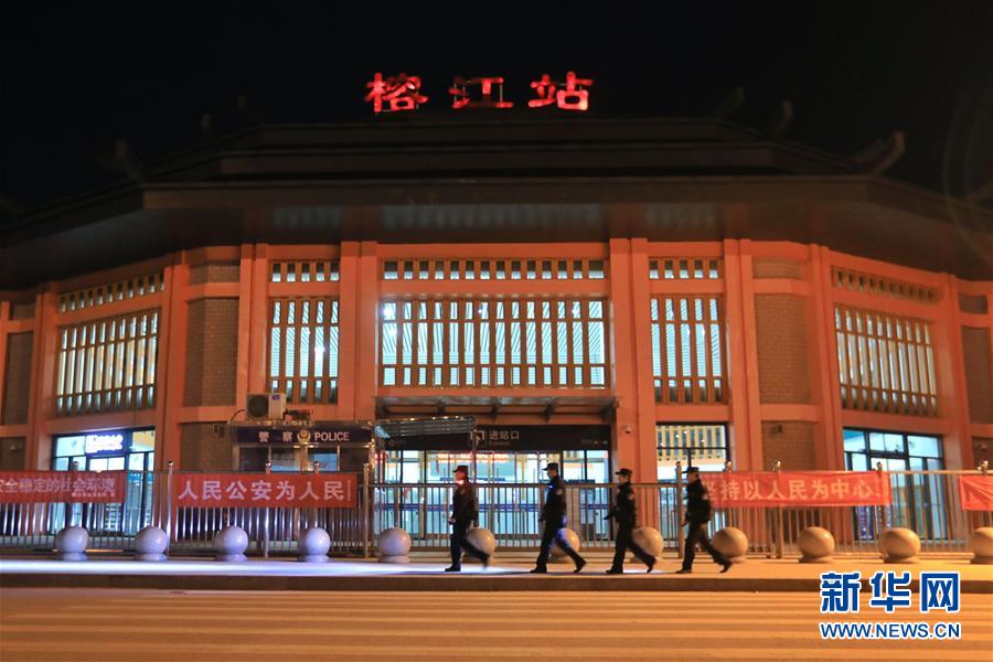 1月22日深夜,民警在榕江站前巡查。 新华社记者欧东衢摄