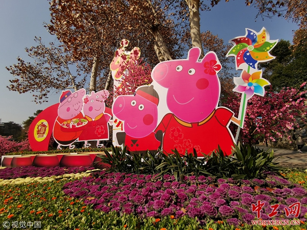 2019年1月23日,武汉中山公园大门内,一组名为《新年迎军运》主题造景吸引众多市民和游人驻足拍照。造景里的小猪佩奇一家穿上新年服装分发糖果,格外喜庆。