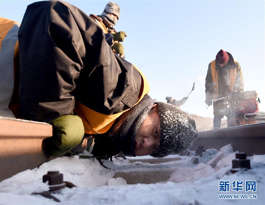 1月23日,在黑龙江省漠河市嫩林线659公里处,加格达奇工务段线路工王波趴在铁轨上看线路高低。 每年冬季,黑龙江省加格达奇工务段的铁路工人都要冒着零下30多度的严寒进行野外作业,桥隧工要对桥梁、隧道、涵洞进行除冰工作,线路工要对铁路冻害进行整修工作,这些平凡的铁路工人不分昼夜,坚守在铁路线上,用辛勤的工作和不畏严寒的勇气默默守护旅客回家的路。 新华社记者 王毓国 摄
