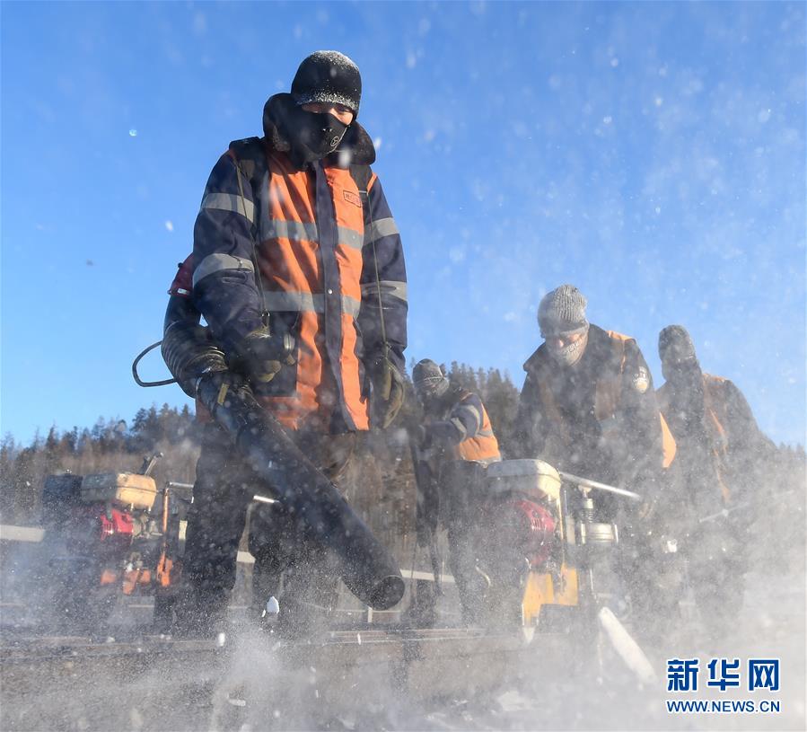 1月23日,在黑龙江省漠河市嫩林线659公里处,加格达奇工务段线路工在进行铁路冻害整修作业。 每年冬季,黑龙江省加格达奇工务段的铁路工人都要冒着零下30多度的严寒进行野外作业,桥隧工要对桥梁、隧道、涵洞进行除冰工作,线路工要对铁路冻害进行整修工作,这些平凡的铁路工人不分昼夜,坚守在铁路线上,用辛勤的工作和不畏严寒的勇气默默守护旅客回家的路。 新华社记者 王毓国 摄
