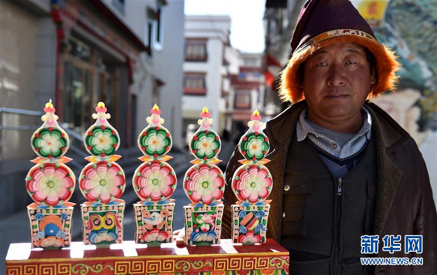 1月22日,摊贩展示酥油花。 2019年藏历新年前夕,拉萨大街小巷充满节日气氛,五彩年货买卖兴隆。 新华社记者 觉果 摄