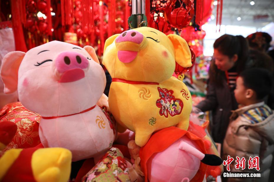 1月23日,正在北京全国农业展览馆举办的2019老北京年货大集人头攒动、热闹非凡。全国各地区优质特色产品及民俗文化在此一一呈现,给北京市民带来精彩纷呈的购物体验。年货大集上的一对“猪公仔”。中新社记者 赵隽 摄