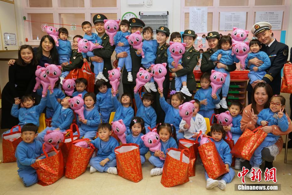 1月24日下午,解放军驻香港部队30余名官兵来到香港嘉福浸信会幼儿园开展“关爱幼童”活动,与幼儿园小朋友一起表演节目、玩游戏、做手工,共同迎接新春佳节。图为驻港部队官兵与幼儿园师生合影留念。中新社记者 张炜 摄