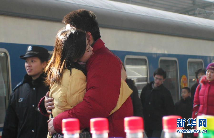 2005年1月25日,一对情侣在济南火车站站台恋恋不舍地拥别。