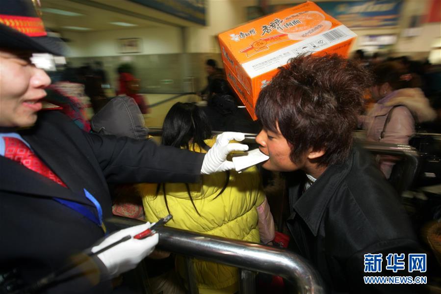 2010年1月29日,在杭州火车站,检票员体贴地从一位背负很多行李的旅客嘴中接过火车票。
