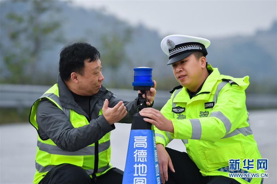 1月25日,高德地图智慧交通业务中心华南区副总经理许健(左)在广佛肇高速公路鼎湖休息区为执勤交警介绍如何使用“智慧锥桶”。