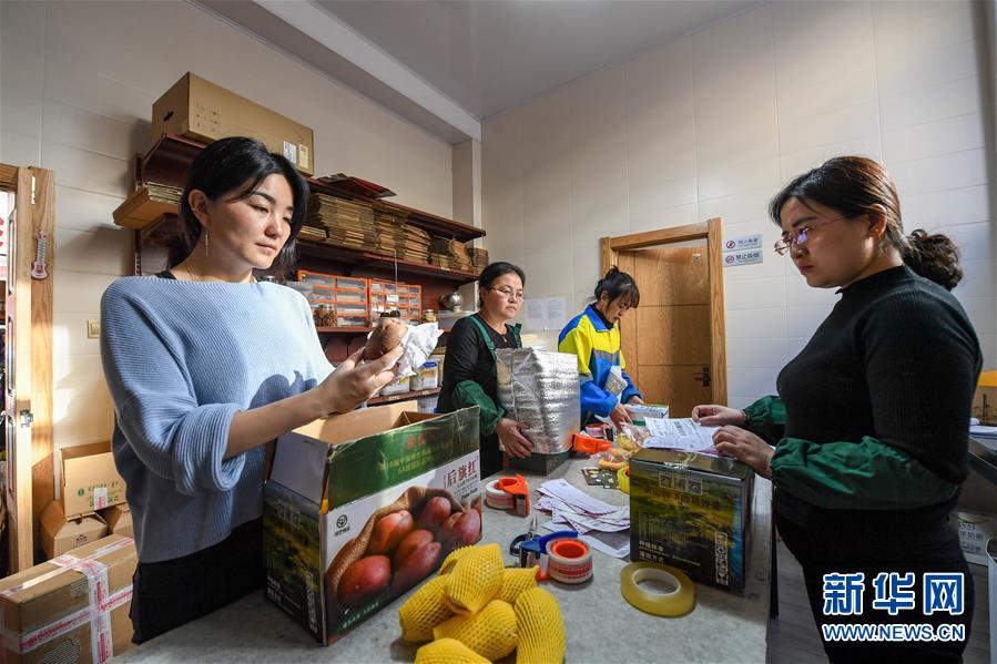 1月24日,郭晨慧(左一)与员工一起包装土豆礼盒。