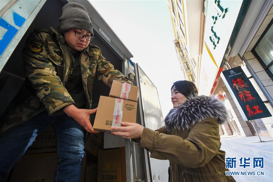 1月24日,郭晨慧将网友订购的土豆礼盒送到快递员手中。 新华社记者 彭源 摄