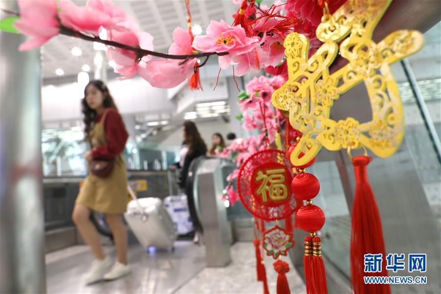 旅客乘坐扶手电梯进入西九龙高铁站(1月25日摄)。 进入2019年春运,香港西九龙高铁站装扮得喜庆吉祥。 新华社记者 吴晓初 摄
