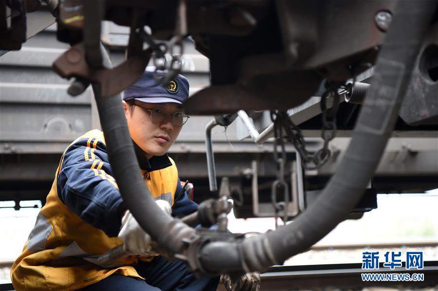 1月25日,铁路工作人员在对货运列车链接部位进行安全检查。 春运期间,中国铁路成都局集团有限公司重庆西车辆段针对全段车辆以及“中欧班列”等重点列车加大检查、检修、安全巡查力度,确保列车运输安全。 新华社记者 唐奕 摄