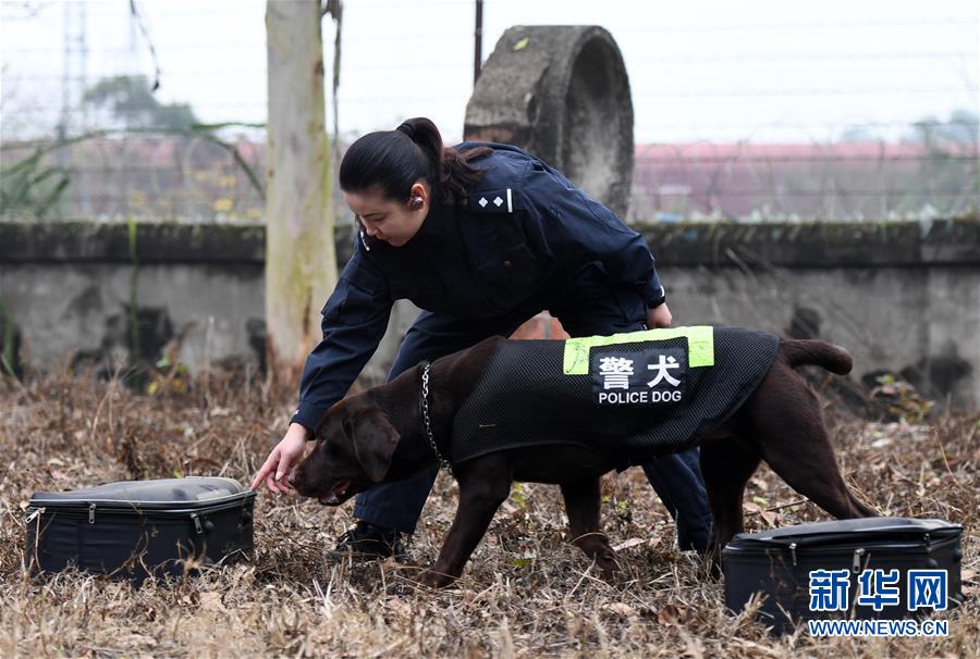 1月25日,在南宁铁路公安局南宁公安处警犬工作队,黄晓莉带着警犬“浩克”进行训练。