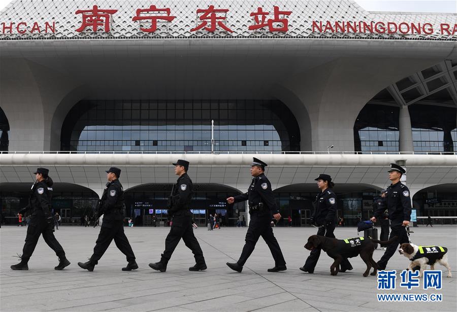 黄晓莉(右二)带着警犬和同事一起在南宁东站巡逻,守护春运安全(1月21日摄)。