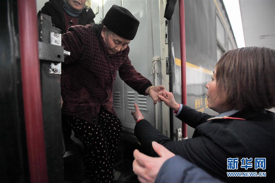 列车员帮助老年乘客下车(1月25日摄)。 新华社发(陈泽国 摄)