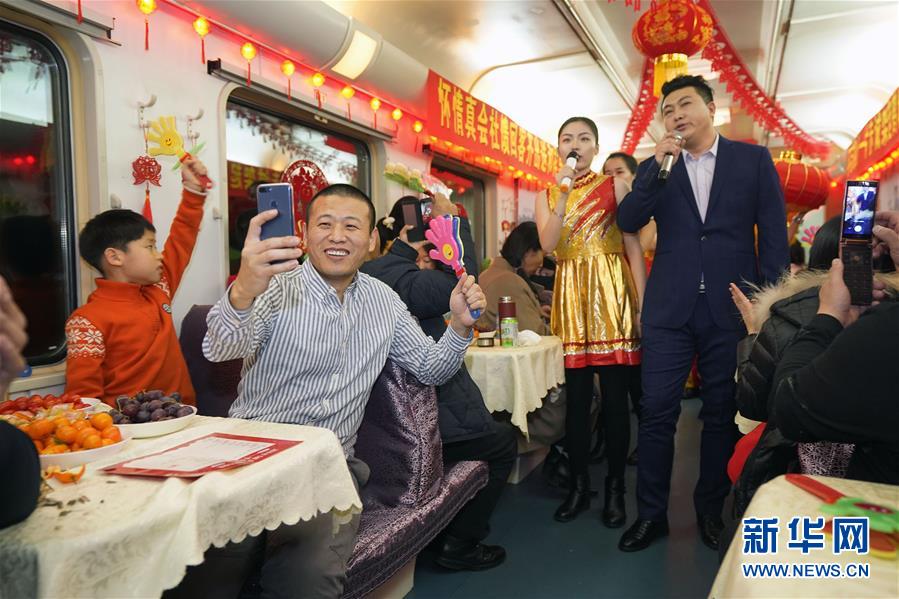 1月26日,在T48次列车上举行的“回家过年”春晚上,一名旅客边看节目边自拍。 当日,一场主题为“回家过年”的列车春晚在由齐齐哈尔开往北京的T48次列车上举行,中国铁路哈尔滨局集团公司齐齐哈尔客运段乘务人员自编自演节目,为春运期间返乡的旅客带来欢乐与温暖。 新华社记者 才扬 摄