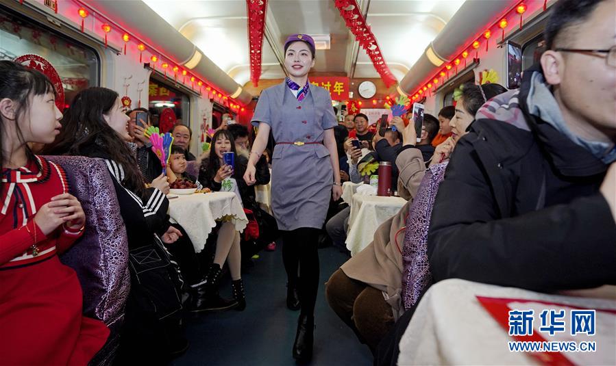1月26日,在T48次列车上举行的“回家过年”春晚上,一名乘务人员进行服装展示。 当日,一场主题为“回家过年”的列车春晚在由齐齐哈尔开往北京的T48次列车上举行,中国铁路哈尔滨局集团公司齐齐哈尔客运段乘务人员自编自演节目,为春运期间返乡的旅客带来欢乐与温暖。 新华社记者 才扬 摄