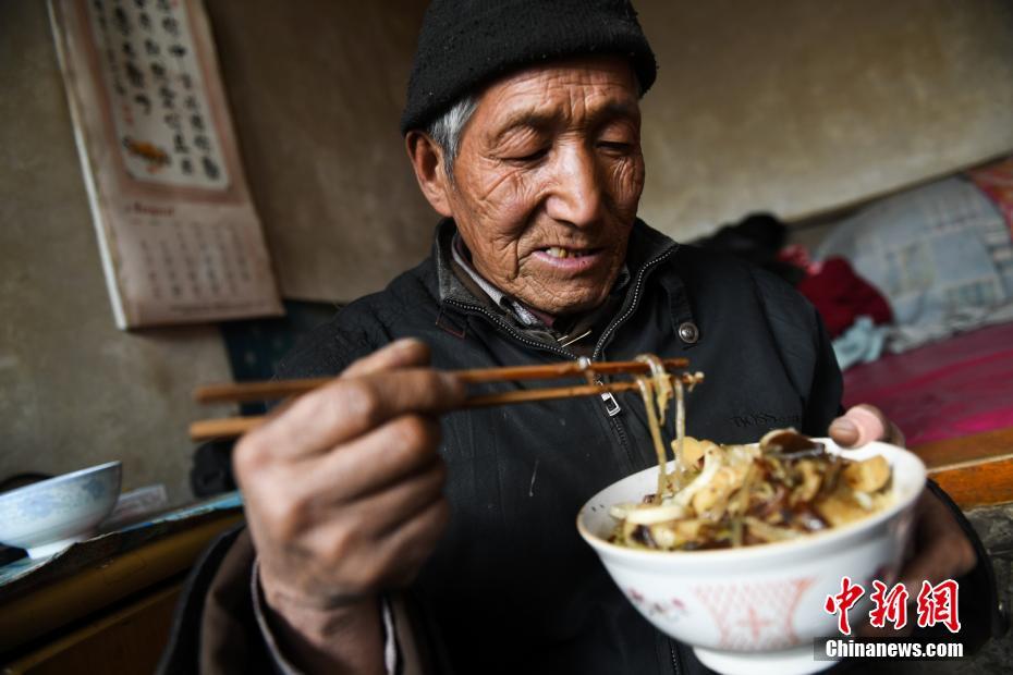 1月24日,山西省榆社县北山晕村,69岁的李铁良简单地吃了口午饭,便忙着赶到村口,准备参加正在他们村里拍摄的一部战争题材的影视剧。武俊杰 摄