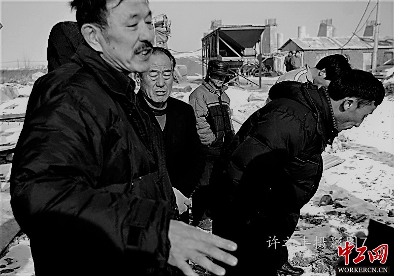 在寒风中苦苦等候的农民工们鞠躬感谢领导上能尽快给他们解决拖欠的工资。