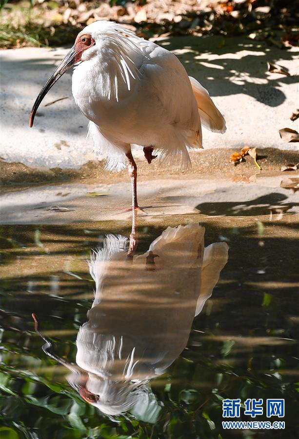 在广州长隆飞鸟乐园,一只朱鹮站在水塘边晒太阳(1月26日摄)。 新华社记者 刘大伟 摄