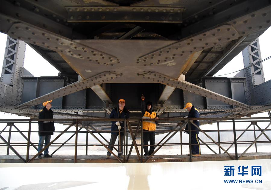 1月29日,巡检工人在桥梁检查车上查看铁轨下方的桥梁状况。新华社记者王凯摄