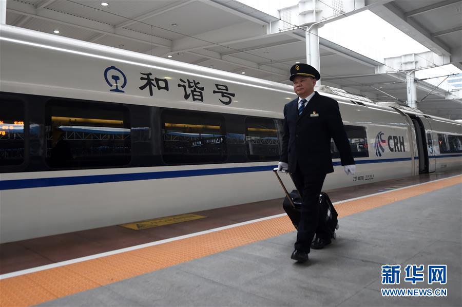 1月29日,在重庆北站,卿太刚从他担当开行任务的动车组旁走过。 新华社记者唐奕摄