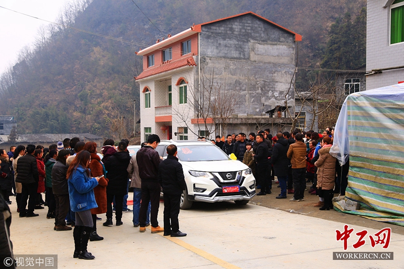 2019年1月29日,陕西安康,接亲的车就要把谭洁接走,老乡们列在车两边依依不舍。谭洁和乡亲们说:“我嫁到山对面的湖北,但我还是镇坪竹叶村的人,我的岗位还在村里,我还是和大家一起干。”。(图片来源:视觉中国)