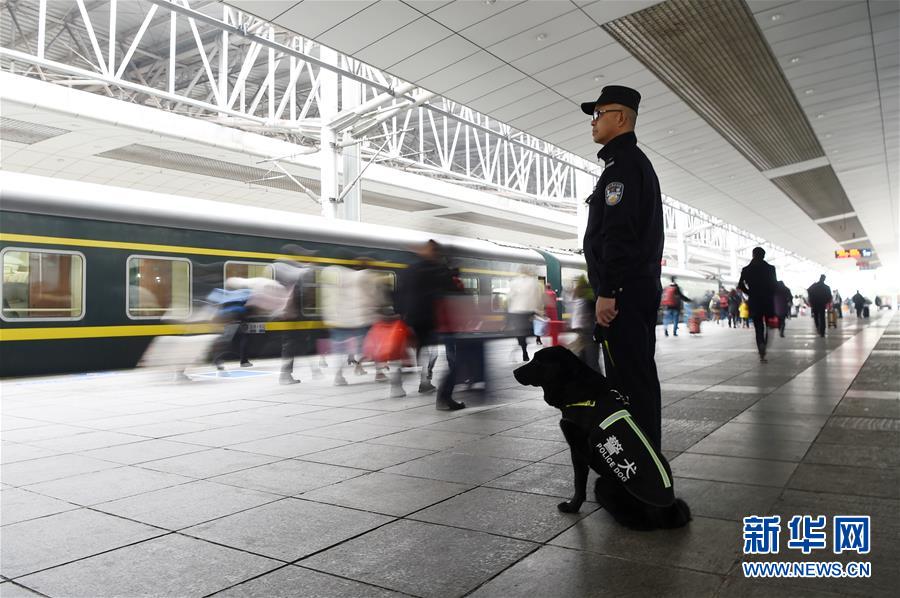 1月30日,警犬“朱蒂”与训犬员曾勇在重庆北站南广场站台上值守。新华社记者 唐奕 摄