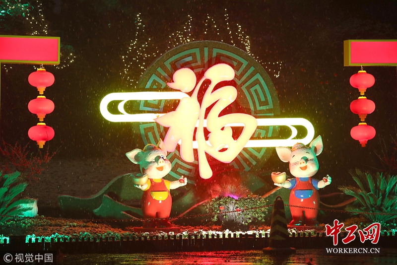 2019年1月30日,郑州迎来降雪天气。郑州市商城路与人民路交叉口三角公园内的一组彩灯已经点亮。(图片来源:视觉中国)