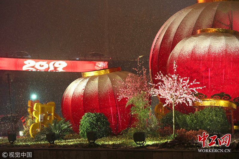 2019年1月30日,郑州迎来降雪天气。晚8点,紫荆山立交桥下的大红灯笼和福字亮了起来,红彤彤的照亮了夜空,十分漂亮。(图片来源:视觉中国)
