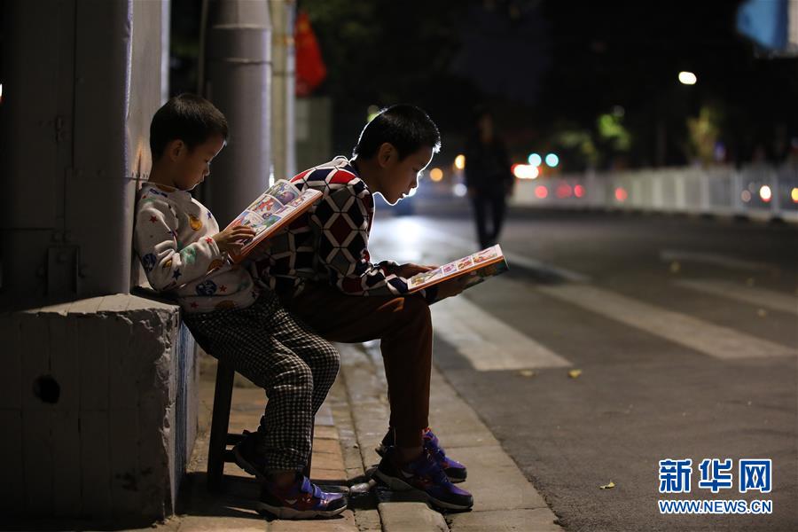 小哥俩在路边看书等妈妈下班(1月30日摄)。 新华社记者田建川摄